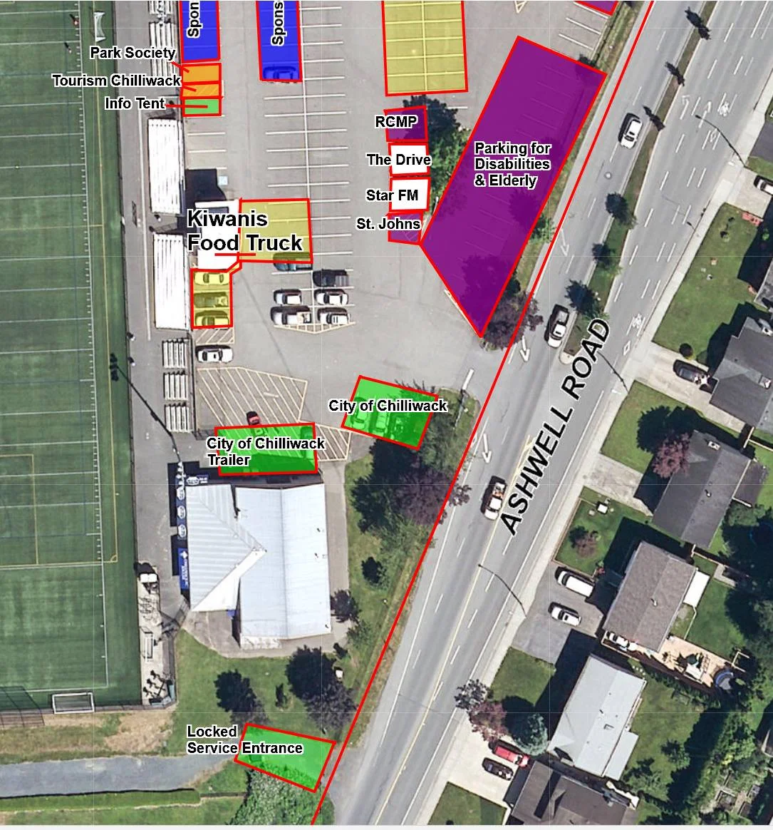 *Please note that the site map and activities may be subject to change without notice. Drink responsibly, do not drink and drive. Fireworks are not pet friendly, for your pets safety please leave them at home. Handicapped parking is available in the designated areas, vehicles parked in service or emergency vehicle space will be towed at the owner's expense. General parking is available at no charge at Prospera Centre and at the far baseball field*