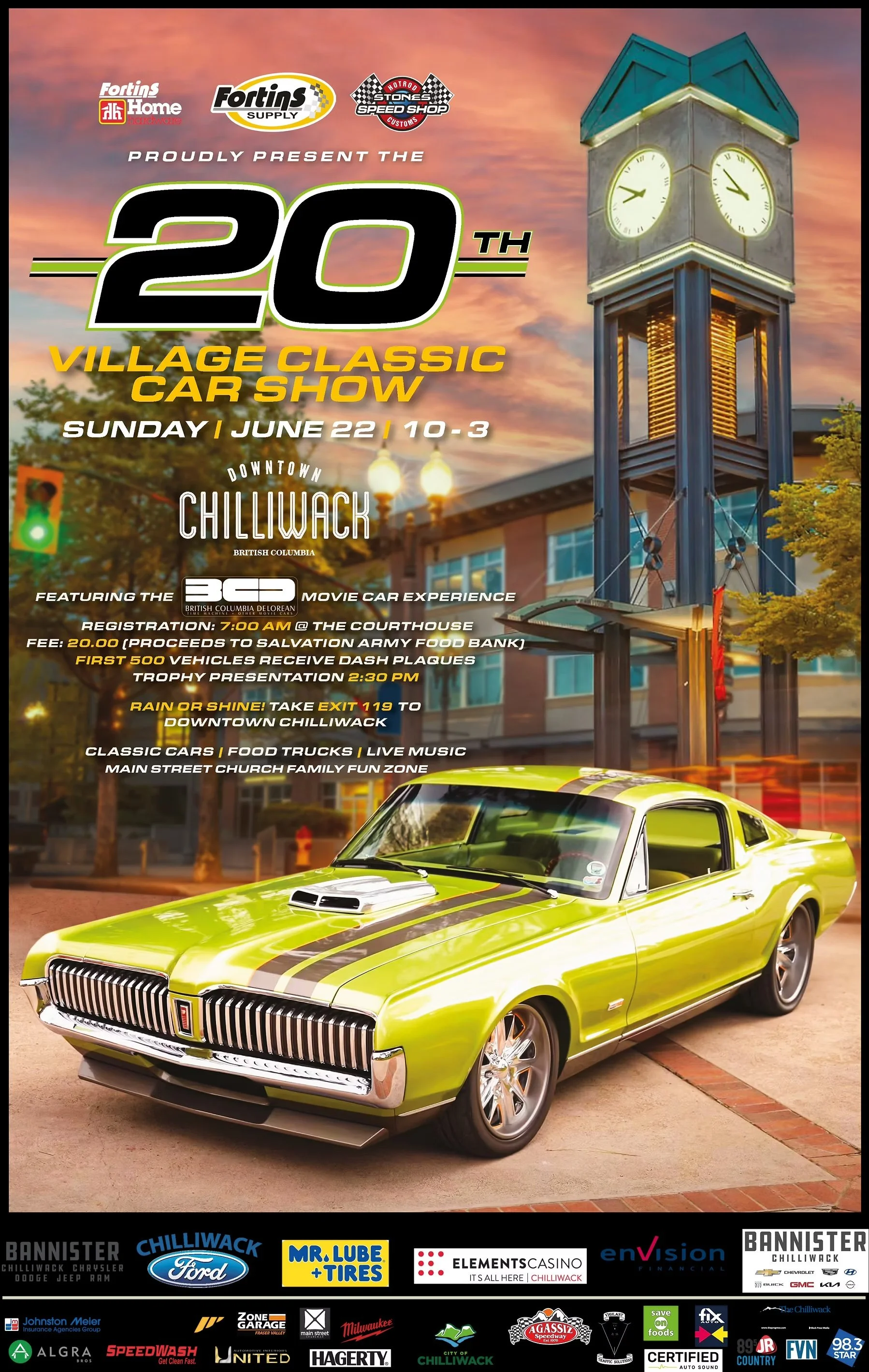 Back to All Events 20th Village Classic Car Show Sunday, June 22, 2025 10:00 AM 3:00 PM Google Calendar ICS 20th Village Classic Car ShowThis free, family friendly event brings over 500 vehicles and thousands of people to Downtown Chilliwack. The event features live music, food trucks, family fun zone and of course…Our downtown merchants will be open to serve you!