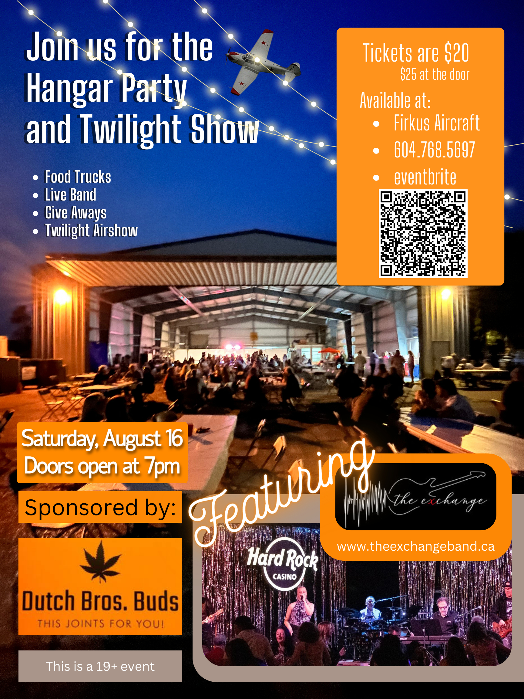 Welcome to the NEW Flight Fest Hangar Party & Dance 2025!!! Join us at Firkus Aircraft Inc. for an unforgettable evening filled with aviation excitement and dance floor fun. Get ready to mingle with fellow aviation enthusiasts, enjoy delicious food from our food trucks and drinks from the bar while you dance the night away in a unique hangar setting with music by “The Exchange”. This event promises to be a one-of-a-kind experience that you won’t want to miss. Grab your friends and come party with us at the Flight Fest Hangar Party and Dance!!! *This is a 19+ event