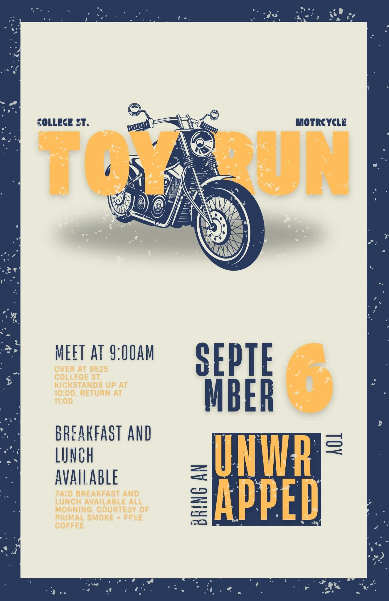 Each fall, local biker groups host Toy Runs to collect toys for children in need this Christmas. Join us at College Street Victory Church at 9 a.m. on September 6th for a morning of community spirit. Enjoy free coffee! Breakfast will be available for purchase from the Primal Smoke Food Truck.
