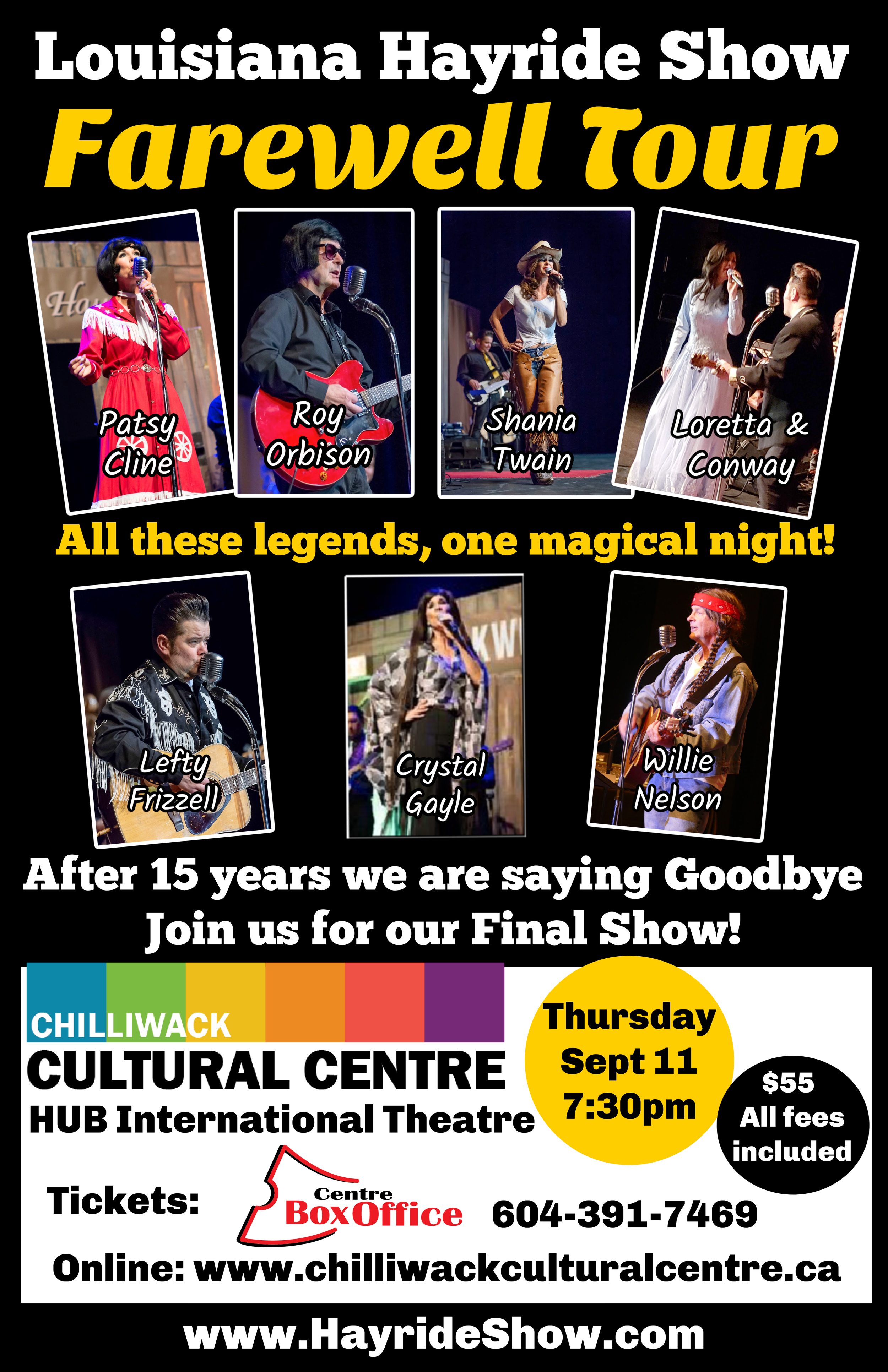 After 15 years of touring across western Canada, the time has come for the Louisiana Hayride Show to say goodbye. Celebrate one last time with Patsy Cline, Willie Nelson, Roy Orbison, Loretta & Conway, Crystal Gayle, Shania Twain and Lefty Frizzell, all in one amazing show! Also enjoy songs by Johnny Cash, Elvis Presley, Buck Owens, Jerry Lee Lewis and more. Don’t miss this opportunity to see the Louisiana Hayride Show one last time. Get your tickets now! Chilliwack Cultural Centre Thursday Sept 11 7:30pm www.chilliwackculturalcentre.ca