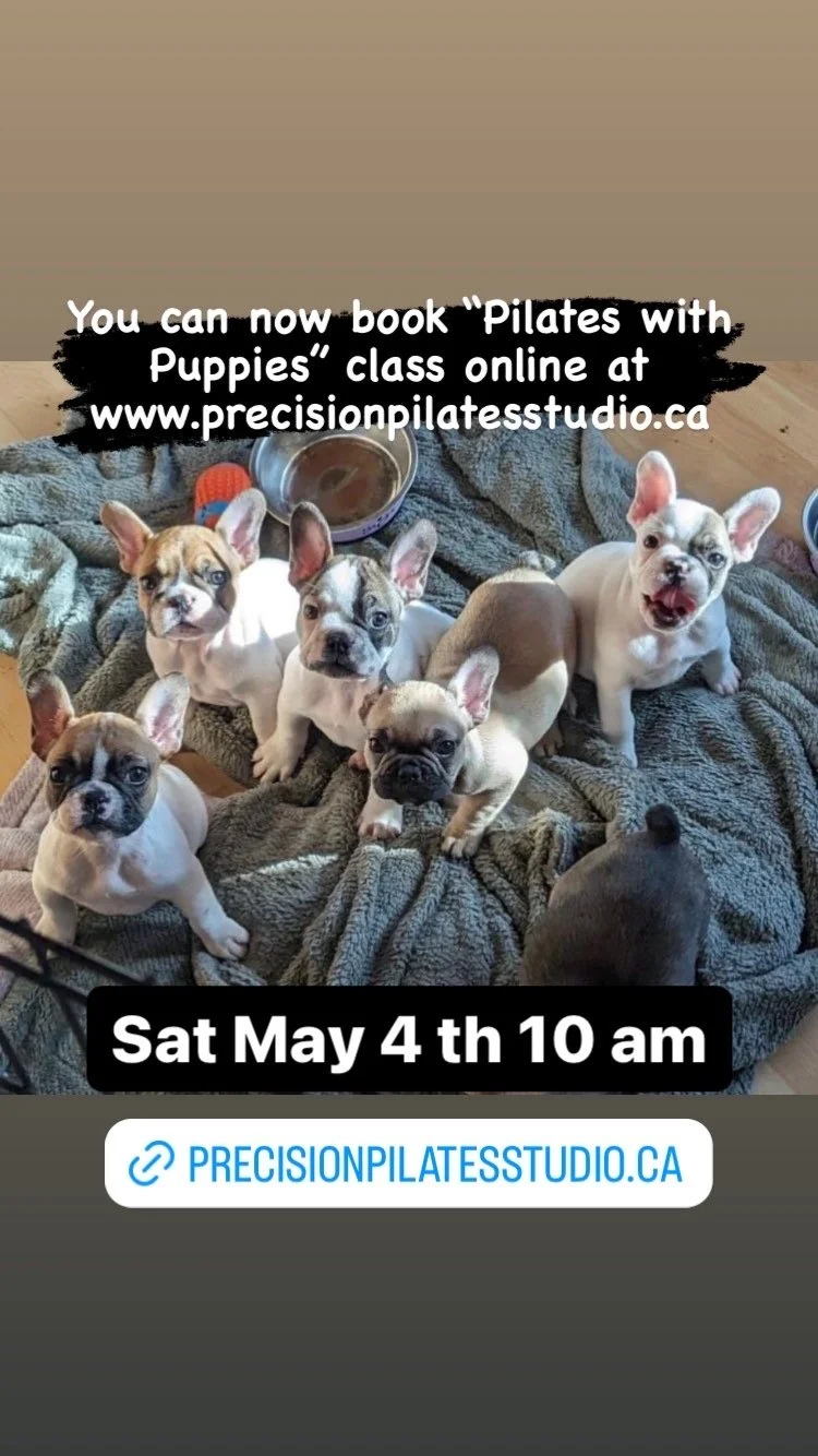You can book online through the studio website http://www.precisionpilatesstudio.ca under “classes” for the “Pilates with Puppies” class! So excited to partner with @logansfrenchies2.0 adorable CKC French bulldog pups for a memorable Pilates class! Class will be outdoor so bring your own mat, layers and we will adjust day of if it rains. These are puppies folks so they may want to nibble at your clothes, fingers and water bottles…or they may want to nap on your feet! Come and help get the pups socialize before they go to their forever homes, and add a few smiles, laughs and Pilates to your day😊