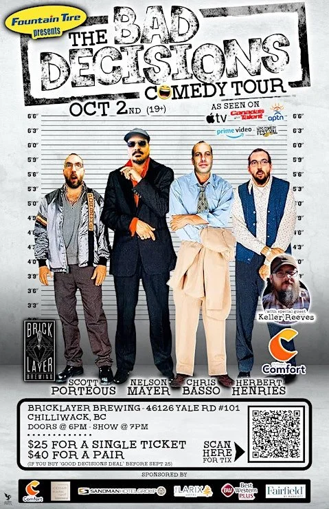 Get ready for a night of non-stop laughter as The Bad Decisions Comedy Tour comes to Bricklayer Brewing in Chilliwack! Featuring a stellar lineup of comedians who have graced the stages of Canada's Got Talent, Amazon Prime, Apple TV, APTN, and The Winnipeg Comedy Festival, this is a show you won't want to miss. Brought to you by our sponsor Comfort Inn. With special guest Keller Reeves.